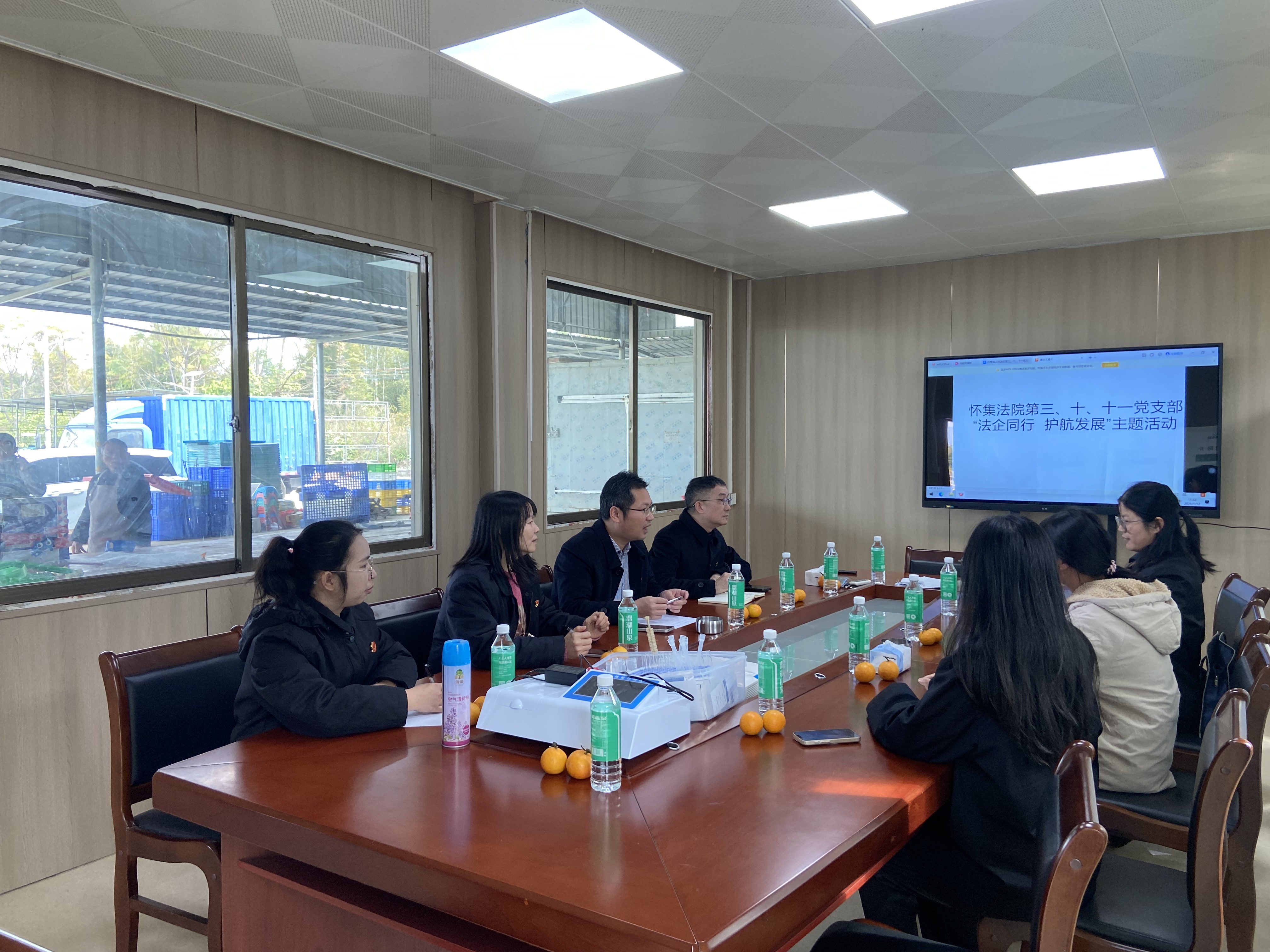 为深入学习贯彻习近平法治思想,落实岳山造林“艰苦奋斗、绿色发展”的精神传承,1月12日,怀集法院第三、十、十一党支部到广东韭小娃生态农业发展有限公司开展“法企同行·护航发展”主题活动,为企业提供精准司法服务,护航现代农业企业高质量发展。党组成员、副院长李加拿参加活动。