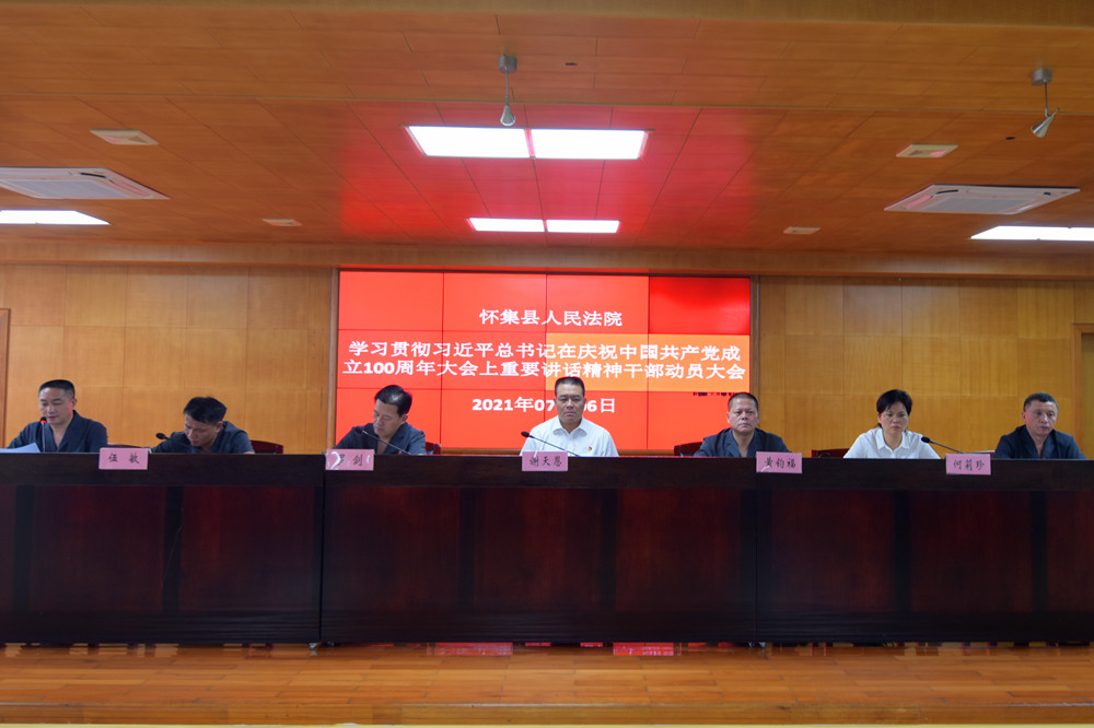 7月6日,怀集法院召开全体干警大会,学习贯彻习近平总书记在庆祝中国共产党成立100周年大会上重要讲话精神,对进一步抓好学习贯彻作出安排部署。党组书记、院长谢天恩出席会议并讲话。