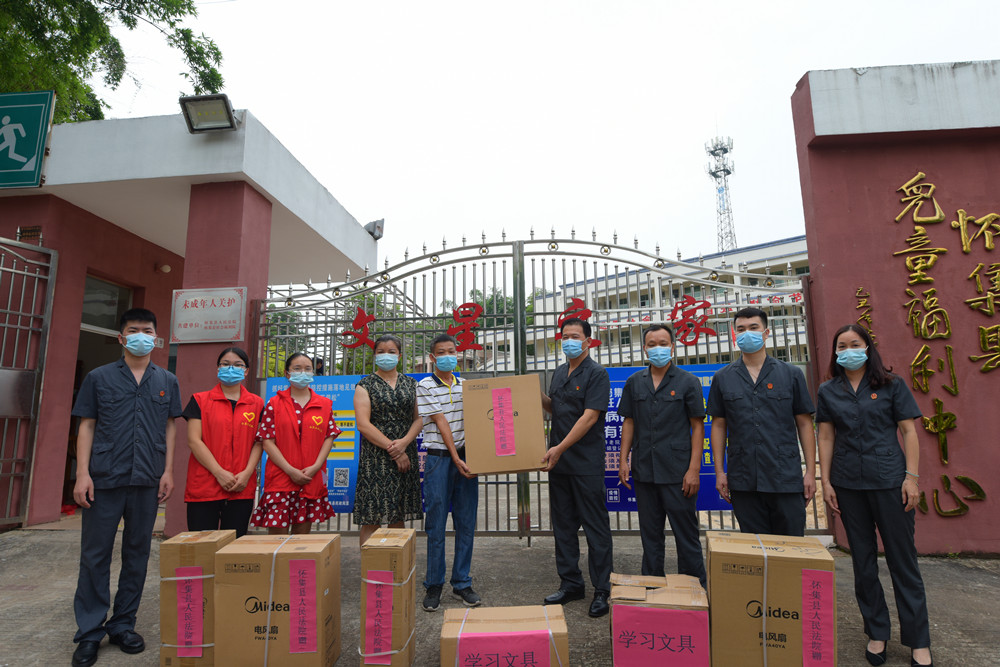 揭牌仪式后还举行了生活用品学习物资捐赠仪式,罗剑副院长代表全体干警向怀集社会福利院捐赠了一批壁扇等生活用品和纸笔等学习文具用品。这批物资是怀集法院执行人员在协调安置一名残疾儿童入住怀集社会福利院过程中,了解到福利院的孩子们急需学习文具等用品,立即组织全体干警们自发募捐。党组书记、院长谢天恩等院领导带头捐款,干警们纷纷慷慨解囊,共筹集善款3000多元采购了这些物资,通过捐赠物资为福利院孩子们的学习和生活提供便利,并营造良好的成长环境。