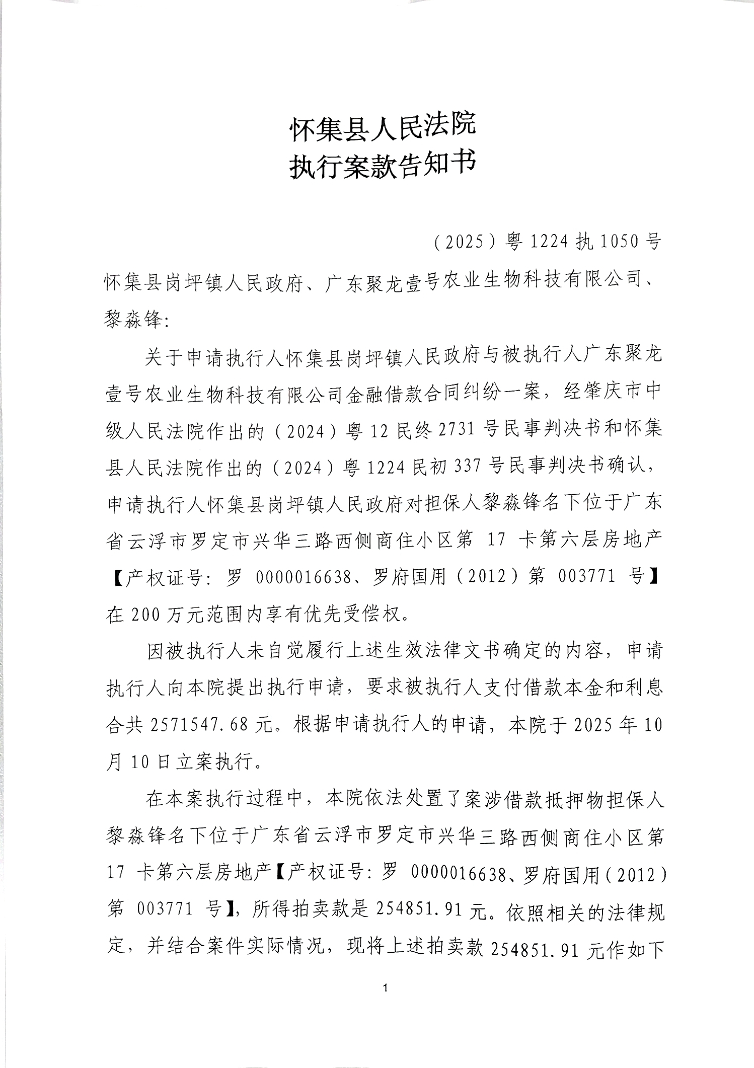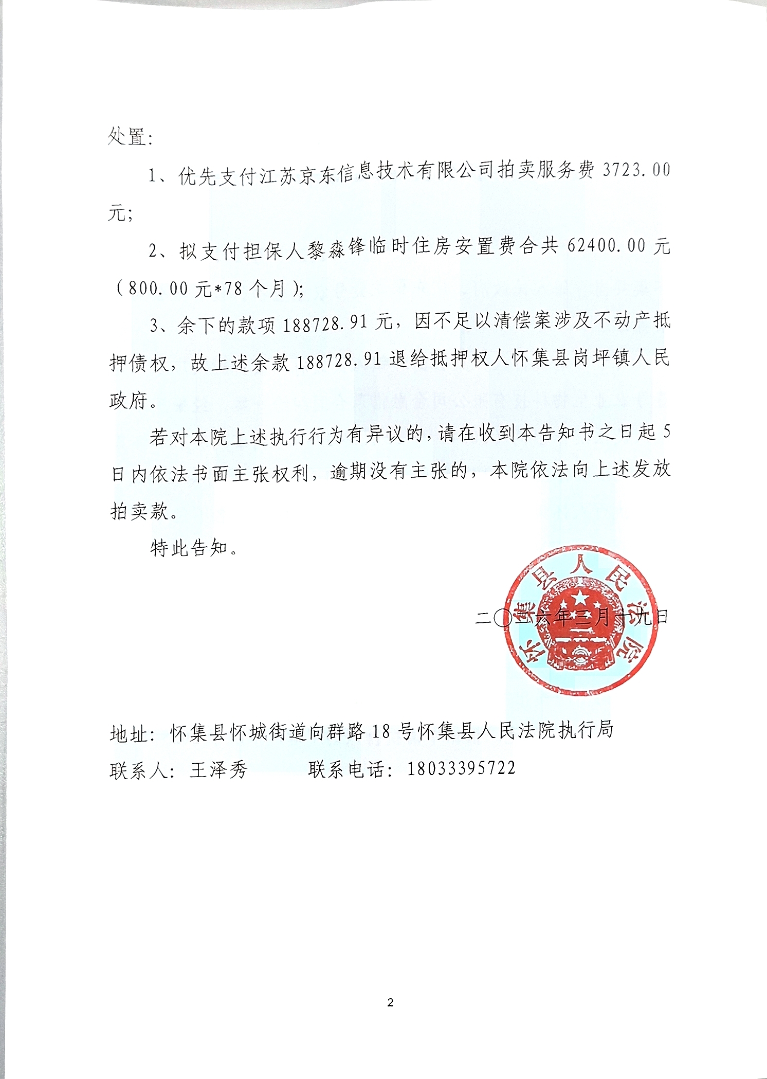 怀集县人民法院执行案款告知书