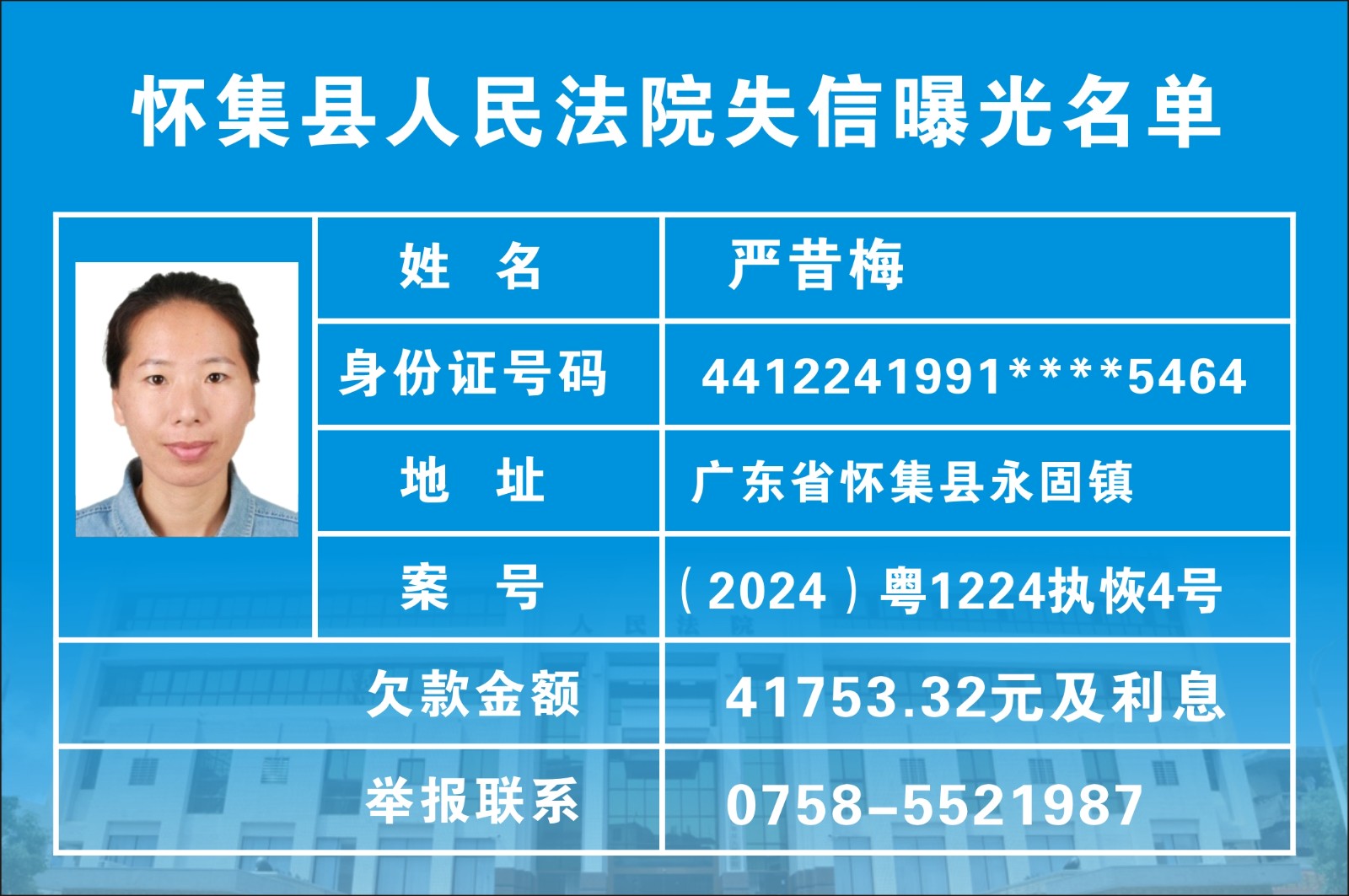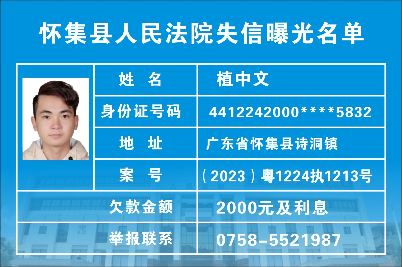 为保障申请执行人的合法权益,维护司法权威,促使被执行人自觉履行生效法律文书确定的义务,依照《中华人民共和国民事诉讼法》第二百五十五条、《最高人民法院关于公布失信被执行人名单信息的若干规定》第七条的规定,怀集县人民法院决定对下列被执行人的名称、公民身份号码、欠款金额、住址等信息,予以公开曝光。